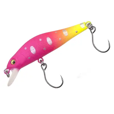 송어루어에서 많이 사용되는 핑크와 오렌지, 옐로우 색상이 섞여 있습니다. 바디의 70%를 핑크가 점령하고 있고, 측면에는 송어의 반점을 모티브로 한 타원형 무늬가 실버색상으로 코팅되어 있습니다.