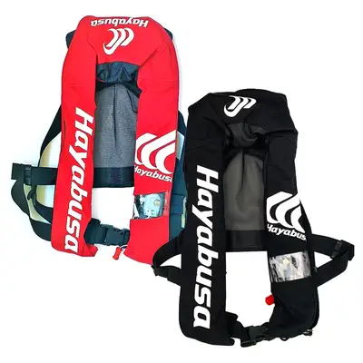 하야부사 자동팽창식 구명복 YT513G. 물감지 센서 탑재. 자동 가스 팽창형. 부력 7.5kg 이상. KC인증. 18G 실린더 사용. 버클 조절 시스템. 확인 윈도우 탑재. 더블 인지 게이터 탑재.