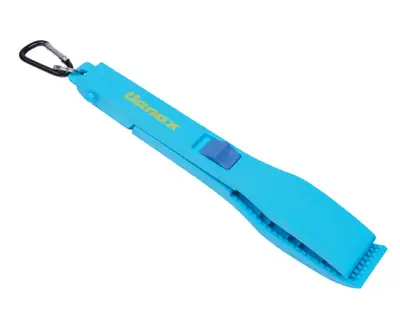 원터치 잠금시스템의 카라비너 피쉬 그립. 미끄러운 어종도 잡기가 쉽고 고정력이 강한 악어 이빨 형상 그립 적용. 간편한 보관과 빠른 사용에 용이한 카라비너 채용. 잠금 버튼을 올리면 잠기고, 내리면 풀리는 원터치 잠금 시스템. 전어, 고등어, 갈치, 볼락, 외 락피쉬류 대상.