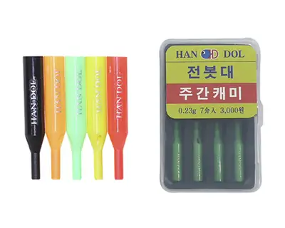 타사 주간캐미는 물에 던지면 부력작용으로 동동 뜨지만, 전봇대 주간캐미는 잠수하므로 주간캐미의 위치변화에 부력변화가 없이 정직한 찌놀림과 자연지나 양어장 모두 특별한 시인성을 확보합니다. 검정색은 일출과 일물 시간대의 역광에서 특별한 효과를 나타냅니다. 실재 현장테스트에서 사용자 모두가 만점을 준 제품입니다. 일반적으로 가장 선호하는 타사 주간캐미와 비교한 사진으로, 전봇대주간캐미가 훨씬 크면서 중량은 미니형전자캐미와같은 0.23g으로 중량호환성이 정확합니다. 한돌 미니형 전자캐미와는 중량이 같아서 직접 교환 사용하시면 되고, 타사 제품과 중량이 틀리면 전봇대의 하단을 조금씩 잘라서 조절 가능합니다. 투척할때 찌가 직선으로 날라가는 효과와 비거리가 높습니다.