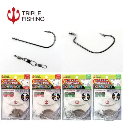 트리플 스넬노트 광어 다운샷 채비. 3세트로 구성된 다운샷 채비로, 스트레이트 혹과 와이드갭 혹 두 가지 옵션 제공. 스넬노트 매듭으로 안정적인 수평 유지 및 채비 사이의 엉킴 방지. 와이드갭 혹은 웜을 끼웠을 때 바늘 끝이 수평보다 밖으로 꺾여 있어 입질 포인트를 확실하게 잡아줌.