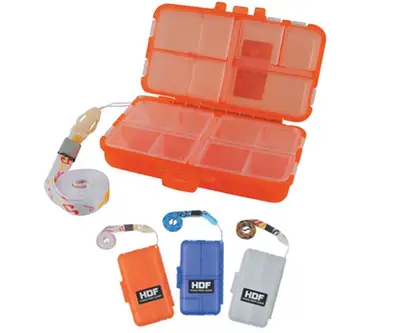 소품 보관 전용 양면형 케이스. 목걸이 끈이 셋팅되어 있어 목에 걸고 사용 가능하며, 구명복 윗 주머니에 수납 가능한 규격으로 출시. 별도 칸막이로 칸수 조절 가능(총 9~15칸 변동 구성). 투명 재질로 내부 식별이 용이하며, 바닥이 둥글게 설계되어 바늘 봉돌 등이 잘 꺼내지는 구조로 제작.