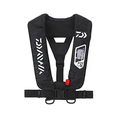 한국 해양수산부 형식 승인필, 착용성 향상형 구명조끼. 국내 실정에 맞춘 형식 승인을 획득한 20년형 자동 팽창식 라이프 자켓. 소형 선박용 형식승인은 물론 KC인증 제품으로 더욱 안전하고 편리한 사용이 가능. 카트리지 장착 상태를 한눈에 알 수 있는 더블 인디케이터 사양. 7.5kg/24시간 이상의 부력, 참고 허리둘레 55~150cm.