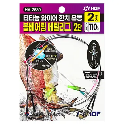 티타늄 와이어 한치 유동 볼베어링 메탈리그 2단 110cm 제품입니다. 해동조구사의 티타늄 와이어 기술로 제작되어 강도와 내구성이 우수하며, 볼베어링 스위벨이 적용되어 부드러운 회전이 가능합니다.