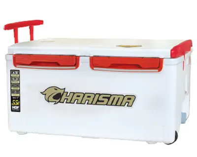 해동조구사의 55L 용량 아이스박스. 카리스마 시리즈로 낚시 및 아웃도어 활동에 적합한 보냉 성능을 제공합니다.