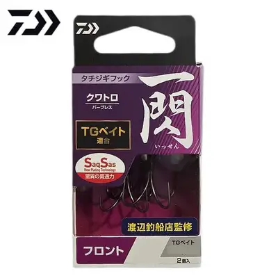 타치우오 지깅용 콰트로 트레블 훅. TG베이트(45~180g)에 적합하며, SaqSas 가공의 롱 테이퍼 스트레이트 포인트 훅을 채용해 높은 훅킹 성능과 관통력을 제공한다. 프론트 타입은 2개입.