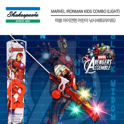 어린이 낚시세트로 77cm 낚싯대와 스핀캐스트 릴, 캐스팅 놀이 세트가 포함됨. 아이언맨 캐릭터 디자인으로 아이들의 낚시 입문에 적합.