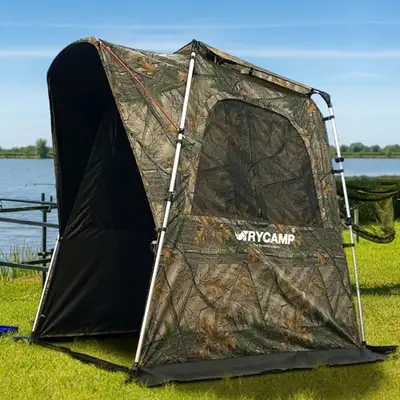 효율적인 전고후저 디자인의 포터블 낚시 텐트로 의자에 앉아 낚시하는 분들에게 안정성과 공간 활용도를 높여줍니다. 전면이 높아 시야를 넓게 확보할 수 있어 낚시에 더욱 효율적입니다.