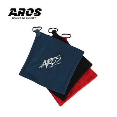 도통한 두께의 AROS FISHING 테리 스퀘어 타올. 낚시 중 손 닦기와 장비 정리에 사용하며, 상단 AROS 로고가 새겨진 알루미늄 카라비너로 벨트·가방·낚시조끼에 간편히 부착할 수 있습니다.