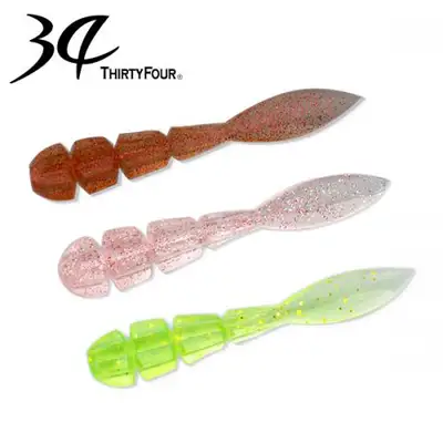 이 웜을 개발 하게된 계기는 "팻타입(통통한)웜이 필요하다"는 한마디로부터 시작되었습니다. 종래의 팻타입 웜의 이점은 부피가 크기 때문에 자중이 있는 비거리가 나오기 쉽고, 부피가 큼으로해서 슬림타입 웜과 비교해 폴 속도가 낮으며, 통통한 외형에서 시각적으로 슬림타입에 비해 더 강한 어필이 가능하다는 점입니다. 반대로 기존에 나와있는 팻타입의 결점은 부피가 있기 때문에 흡입에 대한 저항이 슬림타입보다는 리스크가 있다는 점입니다. 최근에는 지그헤드의 무게를 가볍게 하고 액션을 느리게 주어 대상어에 웜을 가능한 천천히 길게 노출시키지 않으면 입질이 오지 않는 상황이 많아, 팻타입웜의 이점을 잘 이용하고 결점인 흡입에 대한 저항이 큰 부분을 해결하기 위해 제품개발에 착수했습니다. 둥근 팻보디의 바탕에 세로로 슬릿을 넣고 실루엣은 부드러움을 가미했으며, 꼬리부분은 패들로 하고 액션 때의 파동을 크게 할 수 있도록 개발하였습니다. 이후 15cm 이하의 전갱이 후킹률 문제를 해결하기 위해 옆으로 슬릿을 넣고 다시 형상을 변경했으며, 1.3~1.6인치 물건을 사용하여 팻타입만의 이점을 살리면서 결점을 극복할 크기를 찾은 결과가 바로 이 태드폴 모델입니다. 슬릿을 넣는 것에서 자중은 다소 가벼워졌지만 통상의 웜보다 무거워 뛰어난 비거리가 나오고, 표면적이 늘어 물에 대한 저항이 커져 대상어에 보다 오랜 시간 어필할 수 있습니다.