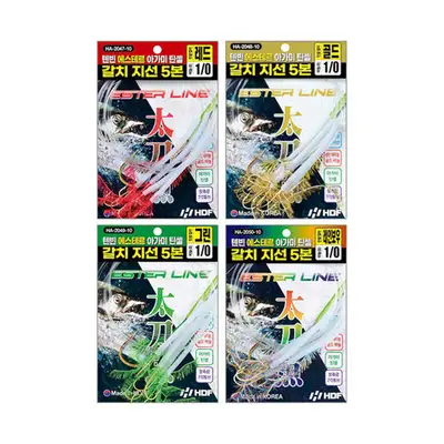 에스테르 라인으로 직진성 & 감도를 동시에!! 텐빈 에스테르 아가미 틴셀 갈치 지선 5본. 반짝이는 아가미 틴셀의 반사력으로 갈치 입질 유도. 감도가 뛰어나고 직진성이 강한 에스테르 라인 12호 사용. 더 높은 입질 확률을 자랑하는 금색 특수 도금. 큰미늘을사용하여갈치의털림을방지. 집어력최강의장축광7각9cm튜브장착.