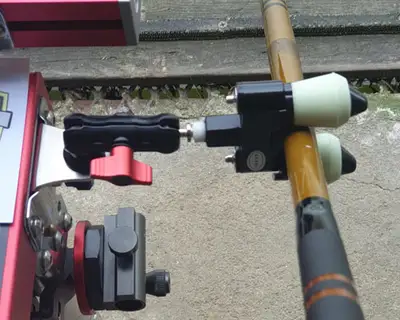 뜰채를 고정시켜주는 경첩형 집게형 거치대. 빨간색 레버를 풀어 헤드의 각도조절이 가능합니다.