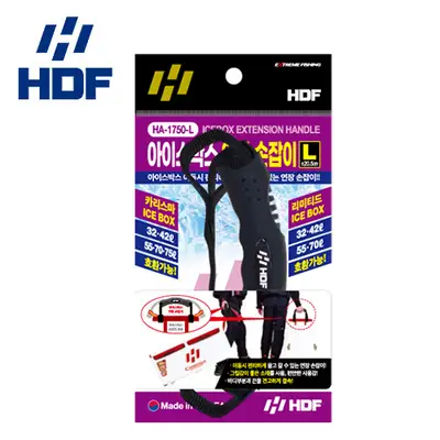 아이스박스에 연장손잡이를 장착한 이미지. 이동시 편리하게 끌고 갈 수 있는 연장 손잡이. 그림감이 좋은 소재를 사용하여 이동시 불편하지 않음. 바디부분과 끈을 견고하게 결속.