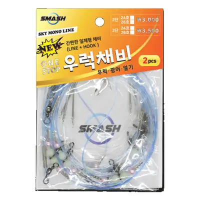 2단 26호 우럭채비. 서해안 연안 침선 우럭/광어 생미끼 기둥줄 채비. 라인 : 본선 30호, 지선 10호. 전장 : 150, 200, 진선 90cm. 단차 : 94, 30cm. 수량 : 2pcs. 용도 : 우럭, 광어, 열기.