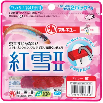 생분해성 수지 원료로 제작된 빙어낚시용 인조미끼. 개별 포장된 2팩 구성으로 하루종일 사용 가능. 생미끼가 아니기 때문에 입문자도 쉽게 사용할 수 있으며, 좋은 탄력성과 빙어가 선호하는 성분과 색상을 추구함.