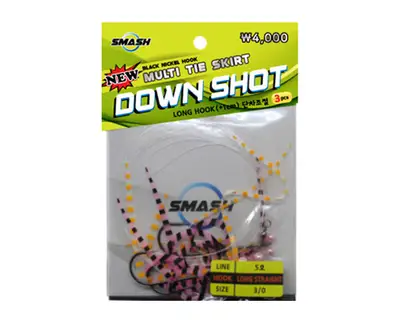 단차조절과 멀티스커트를 복합한 광어 다운샷 채비. 블랙니켈 도금 스트레이트 훅 사용. 상하 단차조절이 가능하며 5호 목줄 사용으로 대광어 사용가능.