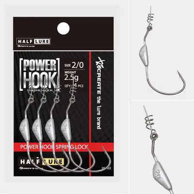 파워훅 리뉴얼버전. 웨이트 부분을 훅아이쪽으로 이동시켜서 좀 더 앞쪽에 무게 중심을 두었습니다. 웨이트의 모양 역시 전면 무게중심에 맞추어서 제작되었습니다. 가장 많이 사용되는 3/0훅부터 5/0훅까지의 사이즈이며, 2g에서 4g으로 바늘사이즈에 맞는 밸런스 추를 채택하였습니다. 웹스프링은 가장 보편적인 형태로 쉽고 빠른 장착에 중점을 두었습니다. 웨이트싱커가 부착된 훅으로써 별도의 싱커를 채비에 장착하지 않고도 캐스팅 하기가 좋으며 워블링 등의 액션 연출이 용이합니다.