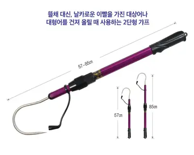 뜰채 대신, 날카로운 이빨을 가진 대상어나 대형어를 건져 올릴 때 사용하는 2단형 가프. 가프는 염분 부식에 강한 내염수성의 고강도 304 스테인리스 소재를 채용했으며, 샤프트는 경량감 우수한 알루미늄 샤프트로 구성되었습니다. 손잡이는 편안한 그립(Grip) 감의 소프트 플라스틱 손잡이로 되어 있으며, 신체 보호 및 부상 방지용 러버(Rubber) 소재 보호 캡이 포함되어 있습니다.