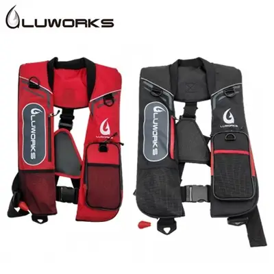 자동 팽창형 구명조끼로 물에 닿으면 3초 이내 자동 팽창. 2WAY 지퍼 포켓, 메쉬포켓, D형 고리, 수동 팽창식 손잡이 탑재. 허리 140cm 착용 가능, 최소 부력 100N.