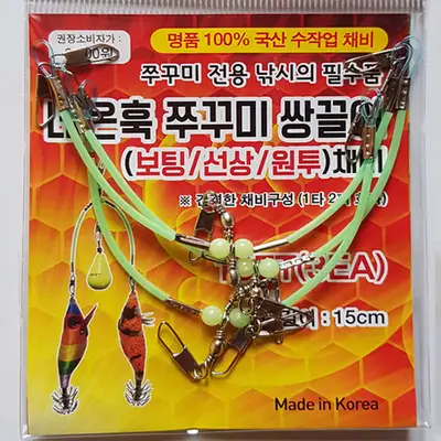 편대형 쌍끌이 채비(1타 쌍피의 주꾸미 전용 채비). 1SET 3EA 구성, 제품 길이 15cm. 일본 수출용 최고급 국산 핀도래 사용. 탁월한 축광 튜브/구슬 채택으로 시인성 극대화.