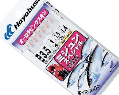 오로라핑크스킨 적용된 민장대용 고등어 채비. 2.5호 바늘에 0.8호 하리스로 구성된 6본바늘 세트.