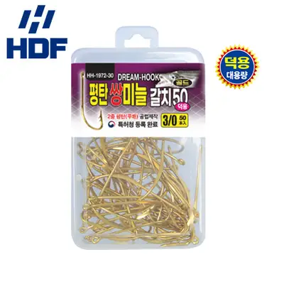 2중 평탄공법의 특수제작 갈치 전용바늘 대용량. 드림훅 평탄 생미늘 갈치를 미니 플라스틱 박스에 호수별로 벌크로 담아 출시한 소비자 실속형 덕용 포장품.