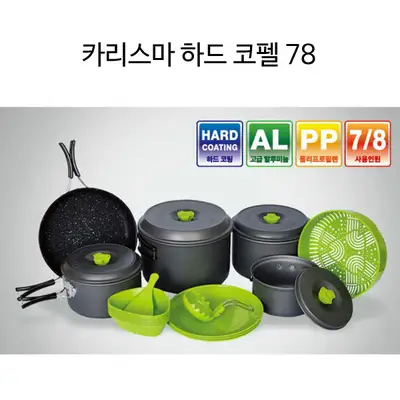 경질코팅 알루미늄 코펠 세트. 7~8인용 구성으로 코펠(大), 코펠(中), 코펠(小), 공기 7개, 국자, 주걱, 다용도 바구니 포함.