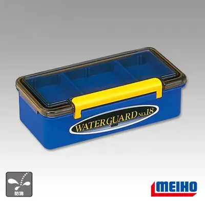 메이호 워터 가드 18 블루 컬러의 방수 보관함. 낚시 소품 및 소형 장비 보관용으로 설계됨.