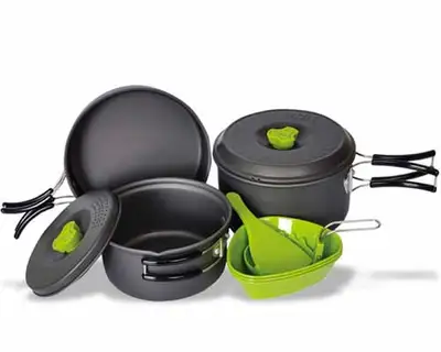 3~4인용 코펠 세트로 코펠, 주전자형 코펠, 프라이팬, 공기, 국자, 주각으로 구성된 실용적인 캠핑용 조리기구 세트입니다.