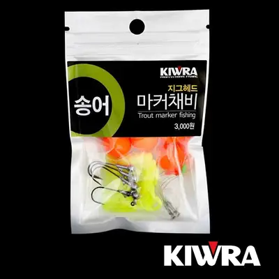 지그헤드 마커채비. 송어 미약한 입질에 대응 가능한 채비. 평창/화천/홍천/가평/강화도 축제에서 효과적인 조과 보장. 구성품: 찌스토퍼/마커4ea/지그헤드4ea/BB호그림4ea. BB호그웹과 마커 색상은 랜덤 발송.