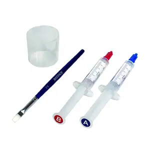 저스트에이스 리페어 킷으로, A제와 B제 각 3cc 세트, 나일론봇 1ea, 믹싱컵 1ea가 포함된 제품입니다. 덧칠 시 A액(수지)과 B액(경화제)을 각 1.5cc씩 정확하게 혼합하여 사용해야 하며, 경화 시간은 온도에 따라 달라집니다.