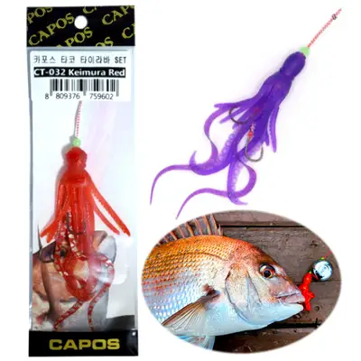 대구 타이라바 전용의 케이무라 꼴뚜기 타코웜 스커트 채비. 파츠가 내장되어 간편하게 바늘과 연결할 수 있으며, 꼴뚜기 형상으로 여러 개의 다리가 현란하게 움직여 먹잇감으로 적극 어필한다. 파츠 내장으로 간편한 바늘 고정 및 스커트 교체가 가능하며, 최적 사이즈 16호와 최고급 BKK 훅, 부드러운 실리콘 스커트를 적용했다. 바늘 크기를 더 키워 대어를 놓칠 확률을 최소화했다고 안내한다.