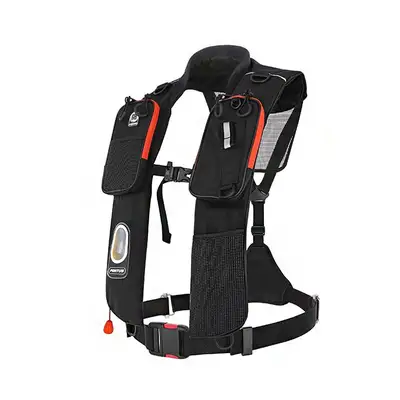 자동 팽창식 구명복. 3포켓 메쉬형 디자인. KC 인증 획득. 국산 인플레이터·카트리지 사용. 가볍고 통풍 우수.