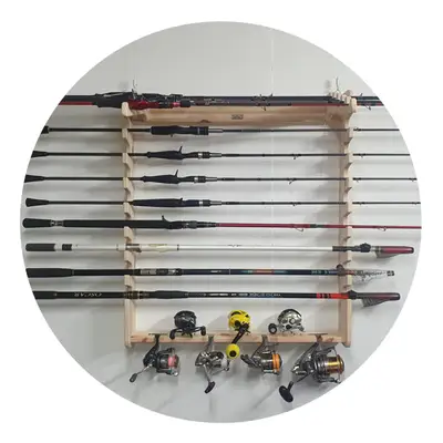원목 벽걸이 낚시대 거치대. 벽에 설치하여 낚시대를 보관할 수 있는 홀더.