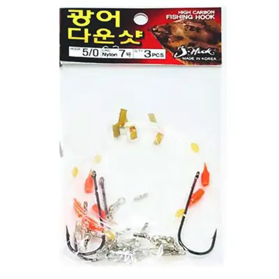 일자 바늘을 사용하였고, 더블등침혹이 추가 되었습니다. 맨도래를 사용하여 줄꼬임을 방지했고, 핀도래를 사용하여 봉돌 장착에 용이 합니다. 핀도래를 하나더 추가해 광어 낚시와 동시에 주꾸미 낚시등을 함께 할 수 있도록 제작하였습니다.
