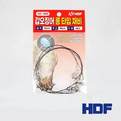 갑오징어 롱타입 채비. 길이 45cm, 지선 40cm, 수량 3本入. 블랙라인4호, 라운드 스냅 2호, 십자회전구슬, 인터락 스냅 2호로 구성된 채비 세트.