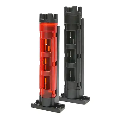 시스템 태클박스 호환 로드스탠드. 메이호, 다이와, 바낙스 등 다양한 태클박스에 호환 가능하며 원터치 버클 방식으로 간편하게 장착할 수 있습니다. 3단계 높이 조절 기능과 발받침 이동 고정 기능이 있습니다.