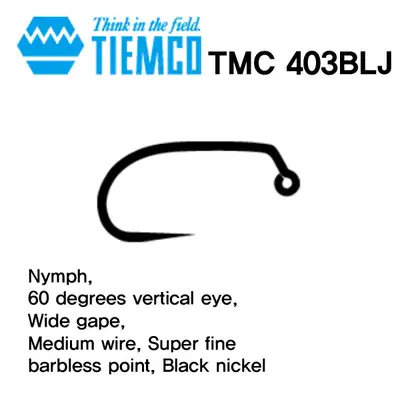 Nymph, 60 degrees vertical eye, Wide gape, Medium wire, Super fine barbless point, Black nickel