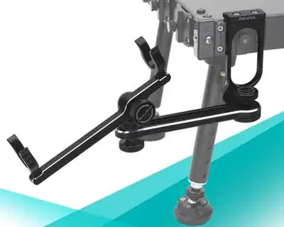 블랙 색상의 시소 뜰채걸이. 경첩 장착부 수평 180도 회전, 거치대 수평 360도 회전, 거치대 상하 70도 회전 기능. 내경 18mm의 부드럽지만 단단한 소재로 뜰채를 안전하게 거치.