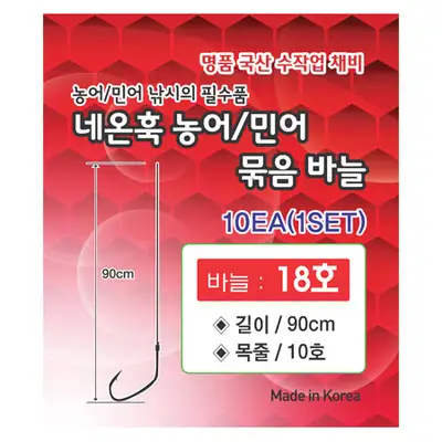 명품 국산 수작업 채비. 농어/민어 낚시의 필수품. 국산 부품 사용 및 순수 국내 수작업 진행. 개별 속지 포장되어 사용이 편리하며 1세트는 10개 묶음 바늘로 구성되어 있습니다.