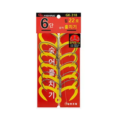 일체형 숭어 홀치기 바늘 6단 (2발) 바늘2개를 본드처리하여 제작한 타 제품과는 달리 바늘과 바늘을 일체형으로 제작하여 유격이 없고 튼튼한 제품입니다 바늘: 22호 / 전장: 200cm / 간격: 30cm ※봉돌은 포함되어있지 않습니다