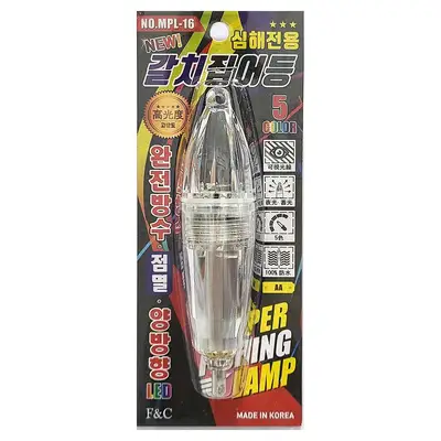심해전용 갈치집어등. 5컬러LED 색으로 구성되어있으며 점멸 패턴으로 연속 점등하는 고기능 설계. 2중고무패킹으로 완전방수. 1.5V AA 건전지 사용.