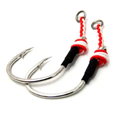 빅게임낚시에서 고기가 가장 잘 털리지 않는 형태와 사이즈 채택. 시중의 인기제품과 디자인을 분석하여 새롭게 대형사이즈로 재제작. 최상의 고퀄리티 도금으로 6개월 이상의 녹테스트 통과. 실용강도 50kg 이상의 엄청난 파워로 국내외 지깅 전어종 공략 가능. 비늘부터 스플릿링까지 50kg 이상 문제 없는 견고한 쓰레드 사용. 메탈채비 유실 후 다시 채비하지 않도록 스위블과 스플릿링 세트상품 추가. 최대파워와 로프이탈방지를 위해 바늘귀도 용접한 최상급 제품.