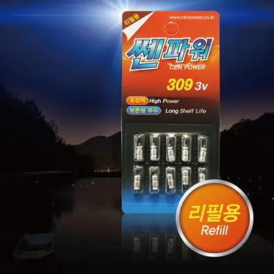 사용자의 의견을 수렴하여 10개들이 전자케미리찜을 배터리가 출시되었습니다. 센파워 10개입은 덕용 제품으로 기준 2개입 제품보다 경제적입니다. 센파워 309 3v 초강력 High Power 보존성 우수 Long Shelf Life 저렴하고활용성우수! 리듬 벗더리를 10개로 덕용포장하여 저렴하게 제공하는 리필전지 SLP 에스엘파워 3093v 리필전지로 밤 낚시 걱정 끝! 선명한 밝기로 오랜 시간 지속 되어 밤낚시에 많은 도움을 드립니다. 제품절취선을 따라 1개씩 사용가능 10EA 1set 구성 감기약 꺼내듯이 개별로 꺼낼수 있어 분실 염려가 없습니다. 작은 길이임에도 불구하고 오래가는 지속성! ON/OFF ZERO/ABS 버니어캘리퍼스 실측 9.06mm 100원짜리 동전 보다 작은 SIZE CR 435 CR 425 CR 322 309 3V 100원 짜리 동전과 비교 케미전지 중량 KF A 00725 CASBEE 0.12 Max 200g Min 0.2g e=0.1g d=0.01g 0.19 낮케미와 동일한 무게 케미전지사용방법 편리하고간편한사용 케미전지 개봉 케미전지 후면부에 있는 절취선을 확인하고 개봉합니다. 전자찌에 삽입 케미전지를 삽입부에 고정 시킨 후 찌에 발광이 될때까지 살살 돌렴합니다. 전자씨 캡 닫기 케미젼지를삽입한후에 방수를막기위해캡을닫아줍니다 결합 시 발광 점등 컷 지속시간 최소 24시간 이상 나루에 전자탑에도 사용가능! 425, 435전자찌에도 호환 425케미전지 결합 넓은 범위에 호환성 센파워 케미지는 다양한 씨를 호환할 수 있는 활용 범위가 넓기 때문에 밤낚시를 편리하게 즐기실수 있습니다.
