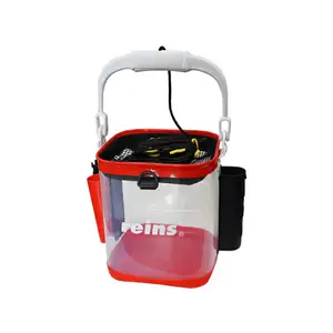 수납력 대폭 업그레이드! 로드홀더 ×2, 피쉬그립 홀더 ×1, 플라이어/포셉/에어 펌프 등을 걸 수 있는 행어랙 ×3, 소형 소품 수납 공간 ×1, D링 ×1. 물 뜰 때 편리한 무게추 부착, 미끄럼 방지 그립이 달린 로프 포함. 버켓 본체 크기: 210×210×250mm, 로프 길이: 약 6m.