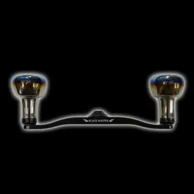 다이와/시마노 호환 튜닝 핸들. 블랙 리미티드 에디션으로 플레이트 중앙에 블랙 마스터 로고 각인, 노브캡과 노브 하단부 블랙, 센터너트 블랙으로 구성됨.