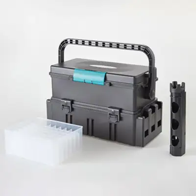 수납공간을 더 깊이 확보한 튼튼하고 수월한 개폐기능의 대용량 멀티박스. 두족류 에기 이너케이스 전용으로 쭈구미, 문어, 한치, 무늬오징어 등에 사용. 로드스탠드 1개 + 63구 에기꽂이 1개 포함.