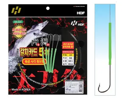 근해 준내만권의 갈치전용, 표준형 지선채비(5本 구성). 잡기 쉽고 대상어 빠기에 유리한, 집어력 최상의 '사각형 장(툰)-축광 튜브' 적용. 대상어 입질 시 정확한 후킹이 가능한, 국산 최고급 갈치 전용 훏셋팅.