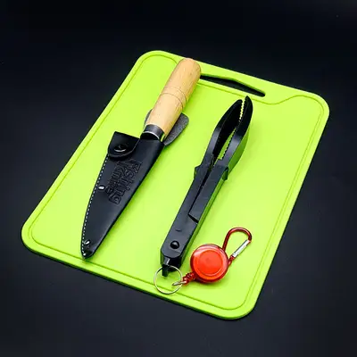 낚시할 때 간편하게 사용할 수 있는 칼, 도마, 집게 세트입니다. 실리콘 재질의 돌돌 말아서 보관 가능한 도마와 안전한 파우치가 포함된 낚시칼, 65cm까지 늘어나는 핀온릴로 구성되어 있습니다. 보관 및 이동이 매우 편리합니다.
