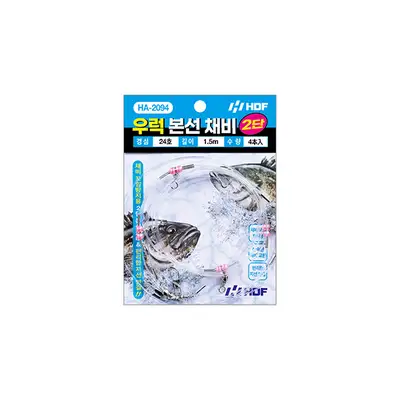 우럭 본선 채비 2단 4본입. 경심 24호 길이 1.5m, 수량 4本入. 채비 꼬임방지용 2단 본선 채비로 우럭 외 다양한 어종의 낚시에 적용 가능합니다. 날개 포장으로 이루어져 신속한 채비 교환이 가능하며, 맨도래를 적용하여 지선을 편리하게 연결할 수 있습니다.